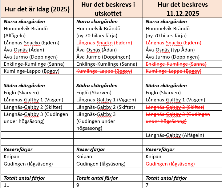Att också endast ha en (1) reservfärja blir sårbart. Ådan är inte isgående och skulle den fastna i isen behöver reservfärjan gå där. OM det under denna tid blir ett haveri på övriga färjor så stannar helt enkelt trafiken på någon rutt. Eftersom att detta händer i princip varje vinter, är alltså oppositionen beredda att stänga en skärgårdsrutt i perioder.