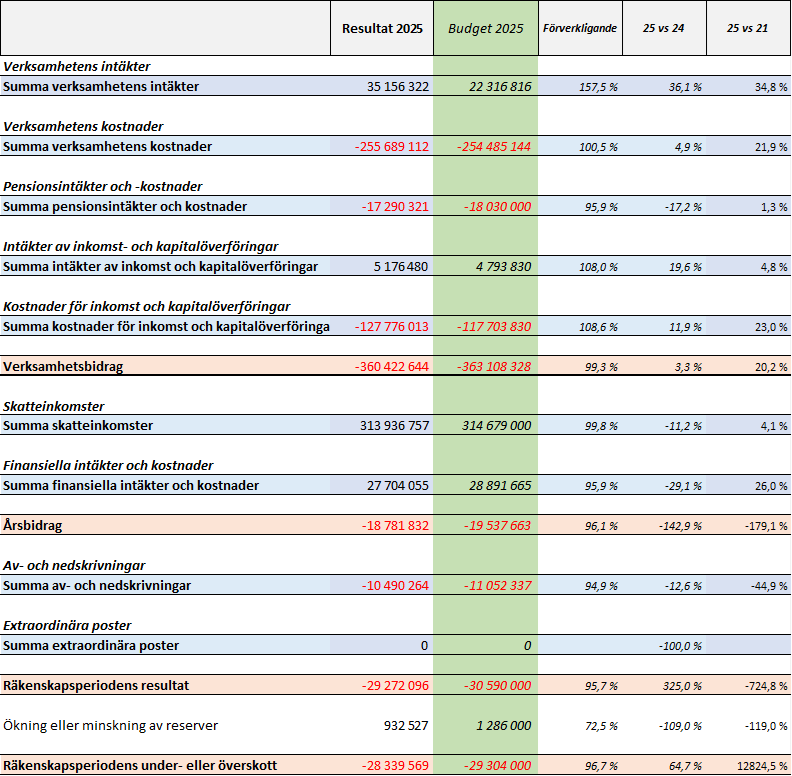 2025 var inget pandemiår. Det var ett normalt år där landskapet inte fick en massa extraintäkter, vilket sätter ljuset på landskapets strukturella underskott. Utan extrapengar från finska staten så klarar vi inte ett nollresultat i dagens förvaltning. Vi fick egentligen lite mindre än vi borde, eftersom vi endast erhöll 200 000 € för utsläppsrätter, när vi hade budgeterat 2 M€. Det här är en annan historia som kräver ett eget inlägg. Med vår rättmätiga andel hade resultatet förbättrats något men inte ändrats i grunden.